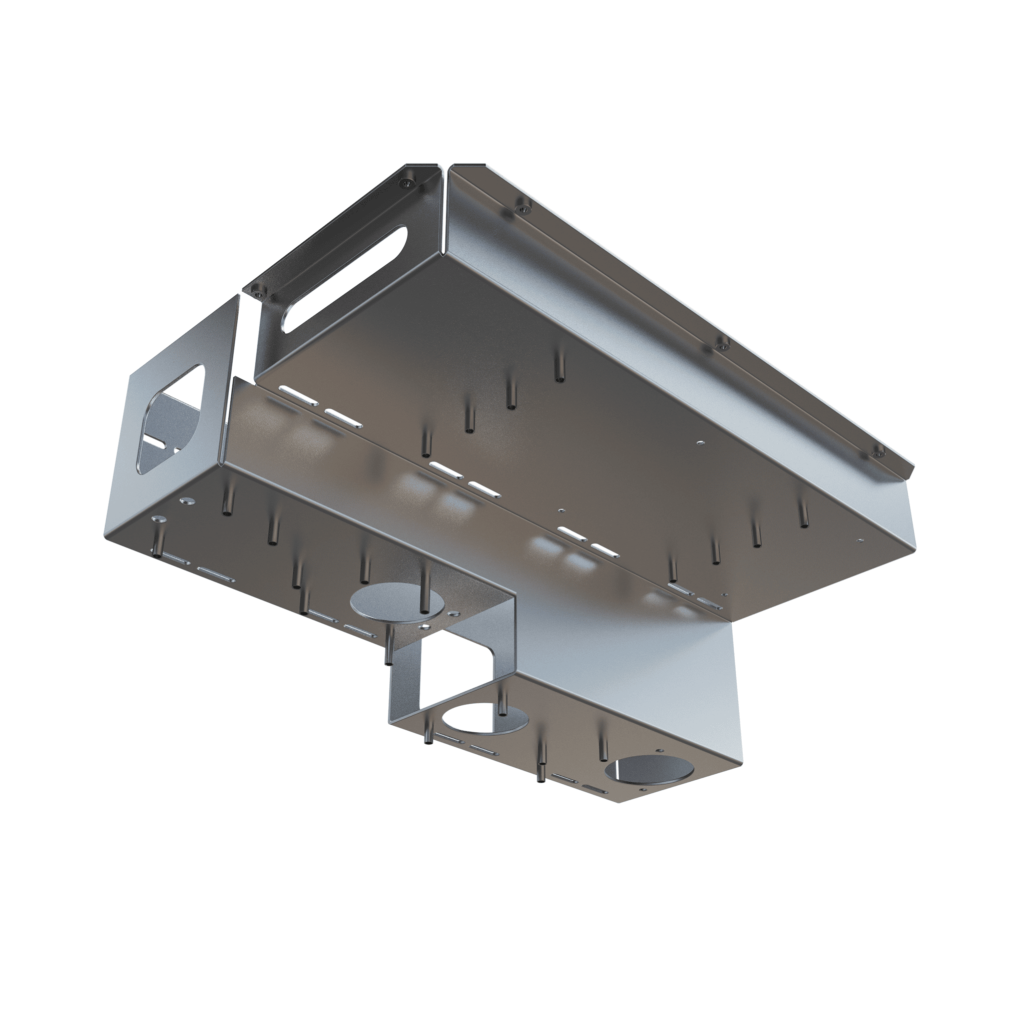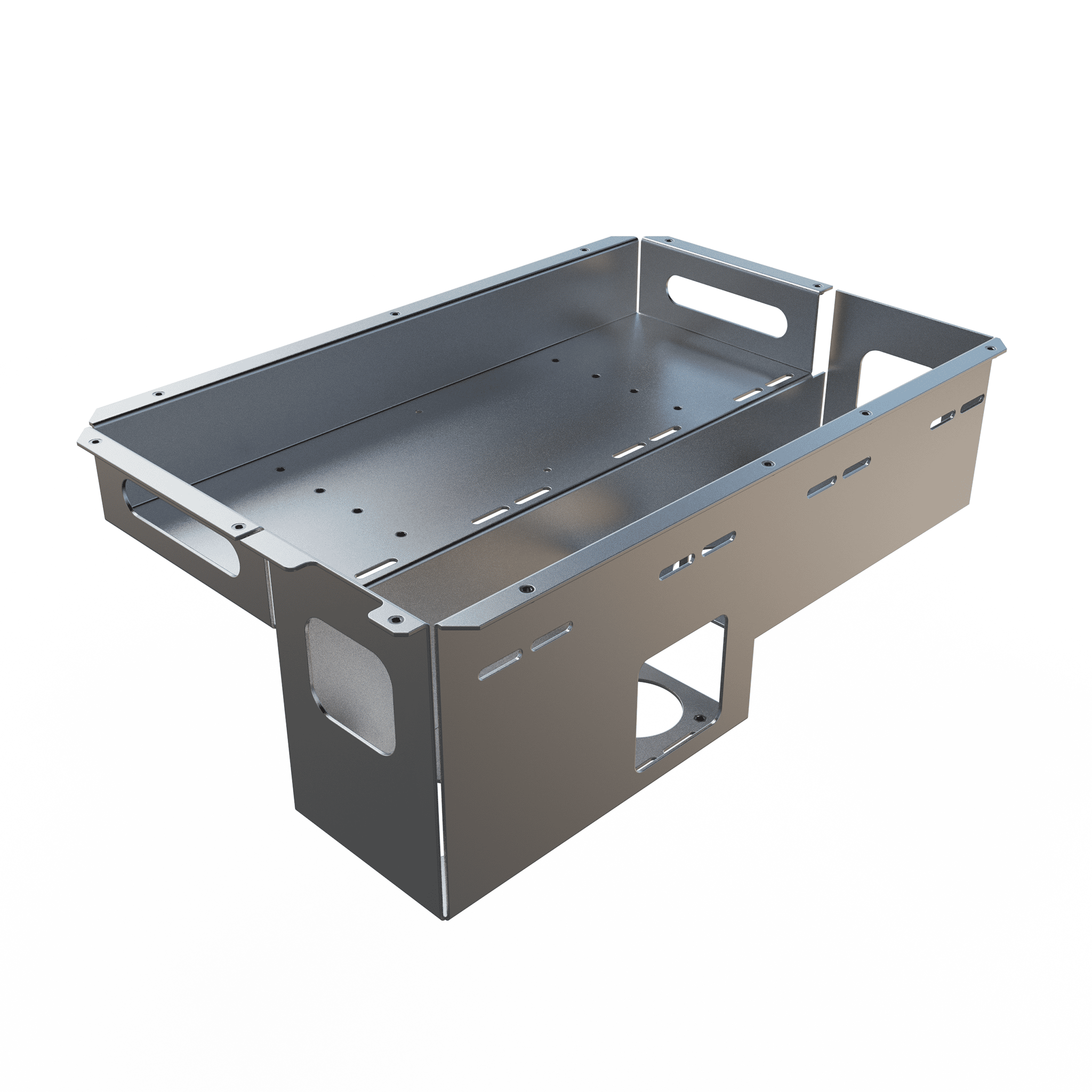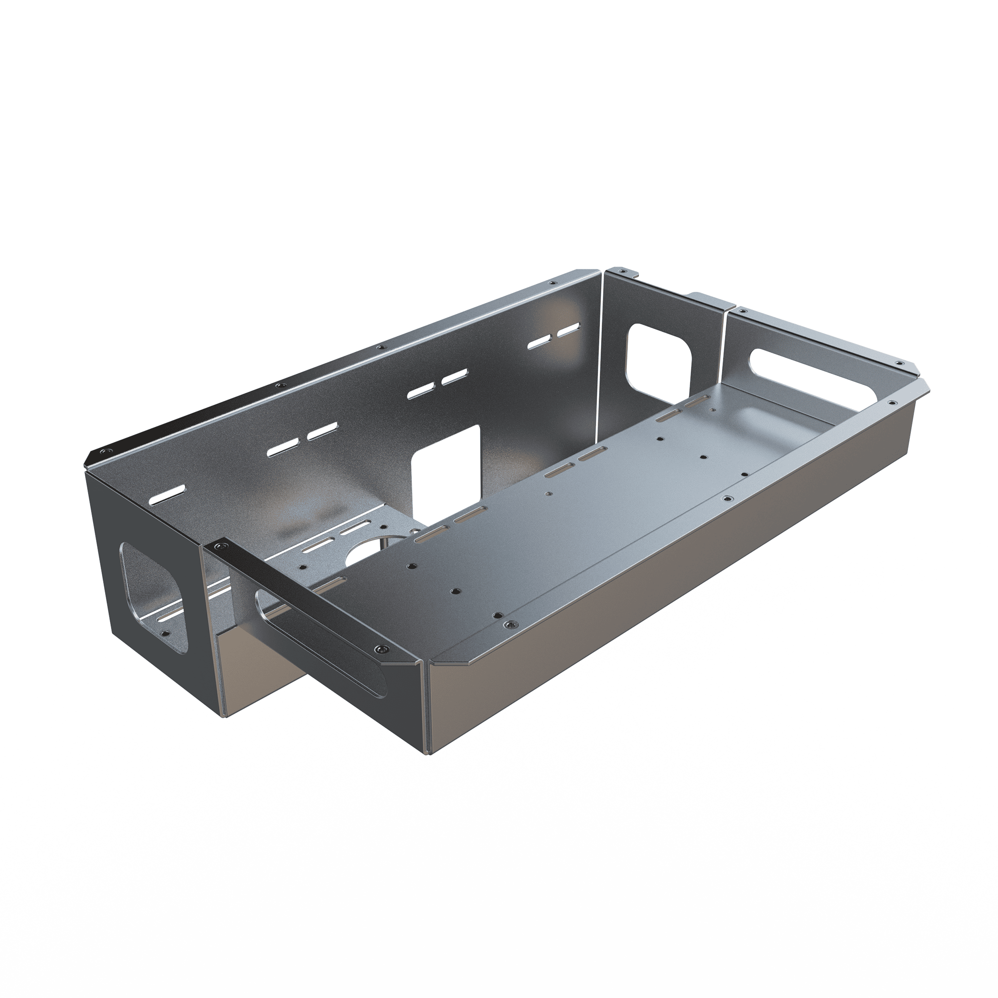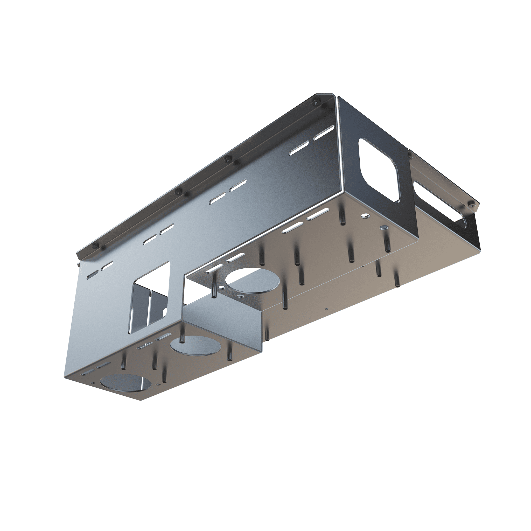 Kutunun dış gövdesi, bağlantı yüzeylerinde yer alan çoklu montaj delikleri sayesinde farklı araçlara, makinelere veya kontrol ünitelerine kolayca entegre edilebilir. Yan panellerde yer alan özel şekillendirilmiş kesit boşlukları, kablo geçişi, havalandırma veya sensör yerleşimi gibi fonksiyonel ihtiyaçlara çözüm sunar. Böylece kutu, hem mekanik koruma görevi üstlenir hem de elektronik bileşenlerin çalışması için gerekli altyapıyı hazır hale getirir.