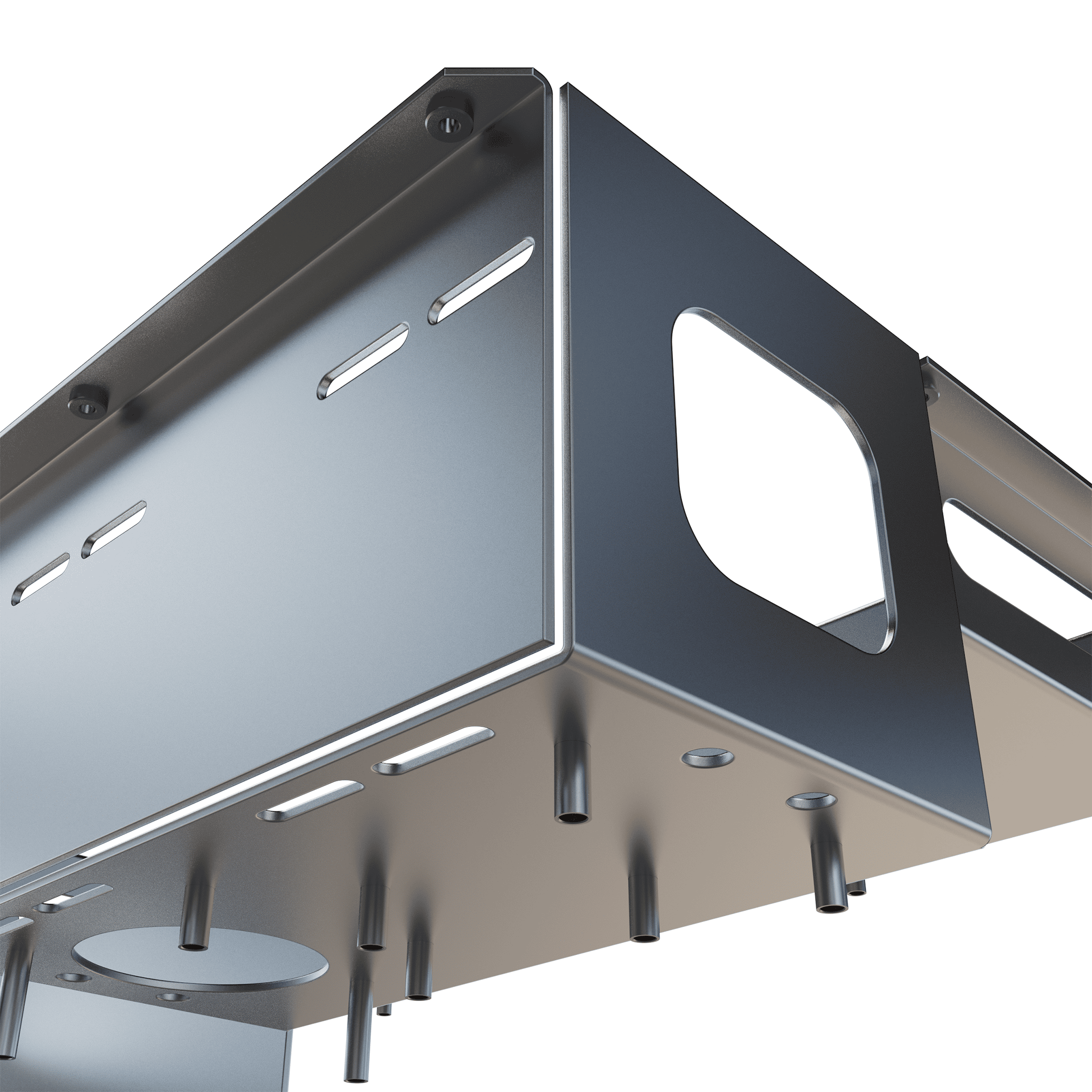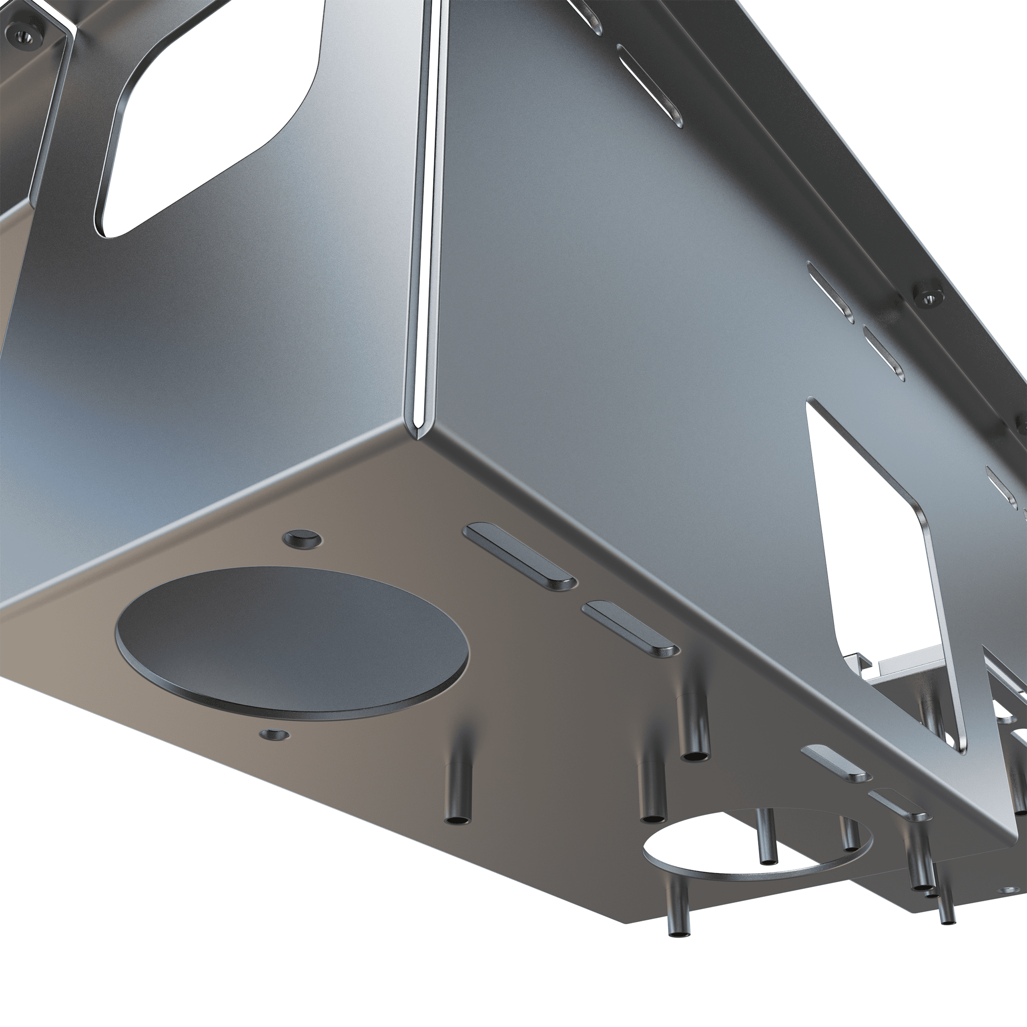 Elektronik Kontrol Kutusu’nun alt yüzeyinde yer alan yükseltilmiş pimler, iç komponentlerin sabitlenmesini kolaylaştırır ve titreşim kaynaklı arızaların önüne geçer. Yuvarlak ve oblong (uzatılmış) delikler ise çok noktalı montaj esnekliği sağlayarak ürünü modüler bir yapıya kavuşturur. Bu sayede kutu, farklı kontrol sistemlerine uyarlanabilir bir platform görevini başarıyla yerine getirir.